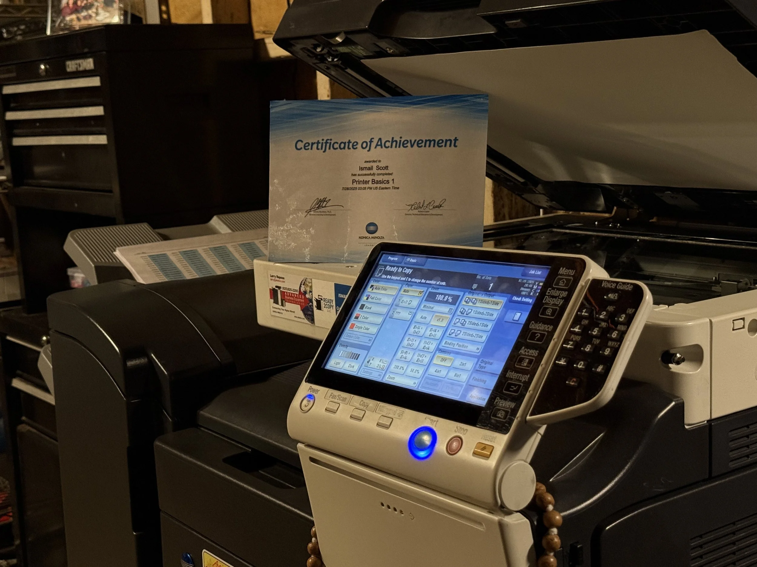At Ready 2 Copy LLC, I bring certified expertise directly from Konica Minolta, having completed their official training programs in areas such as color management, imaging systems, networking fundamentals, and copier diagnostics.
